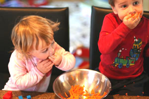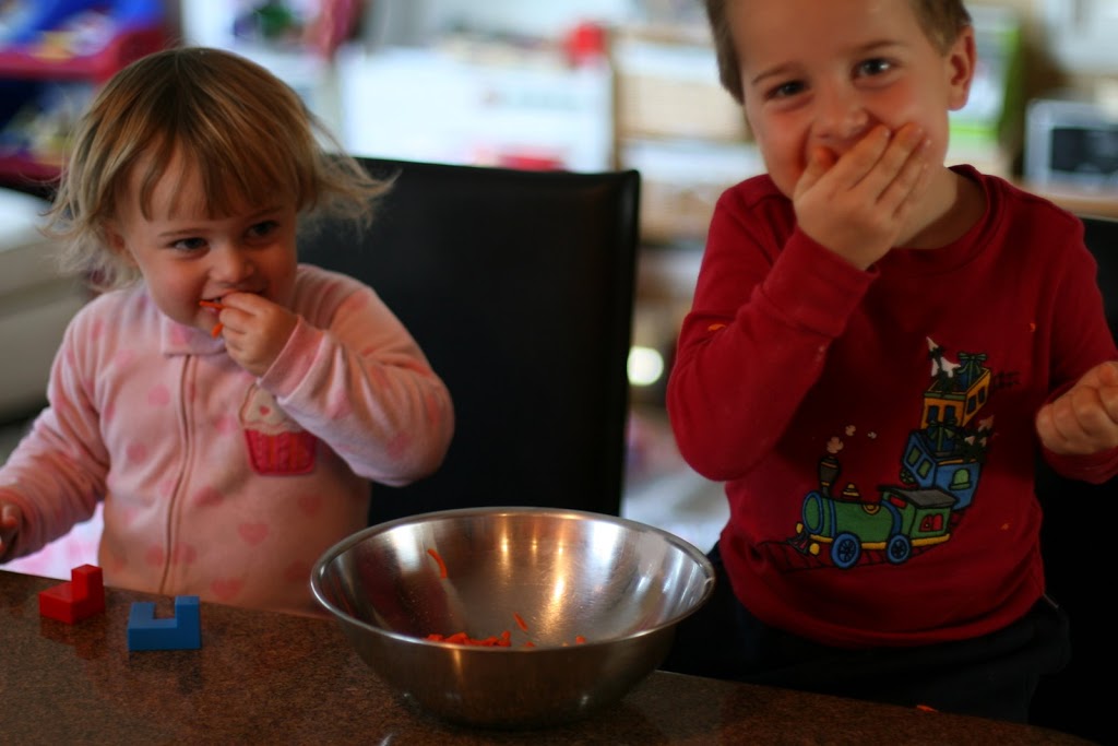 After I made the muffins, I shredded another carrot (per the request of my almost 4 year old son). I couldn’t resist sharing. These two crack me up! But it goes to show that you should never make assumptions about what kids will eat. How many of you would give your children shredded raw carrot for breakfast? I never thought I would but the proof is in the pudding…or maybe the muffins!