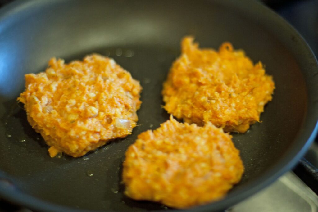 - Form into patties and cook over medium heat in a non-stick pan until golden brown on each side. Alternatively, bake in a 400F oven on a greased cookie sheet, for about 20 minutes, turning once.