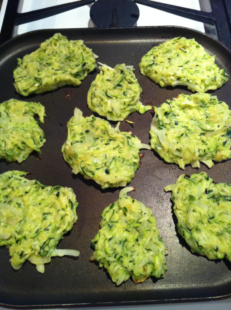 I settled on zucchini muffins (I used my gluten-free carrot muffin recipe but substituted zucchini for carrots). While using the food processor to shred the zucchini, I thought why not try zucchini pancakes. It’s one of those dishes I haven’t made since being gluten-free. I didn’t think it would be that hard; I just wondered if the kids would be up for it.