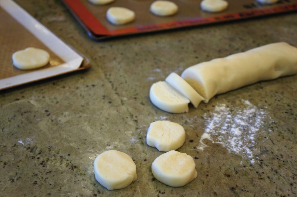- Remove dough from fridge and wait 5 minutes. Roll dough between two sheets of parchment to about 1/4-inch thickness. Cut into desired shapes. Or roll into a log and cut circles.